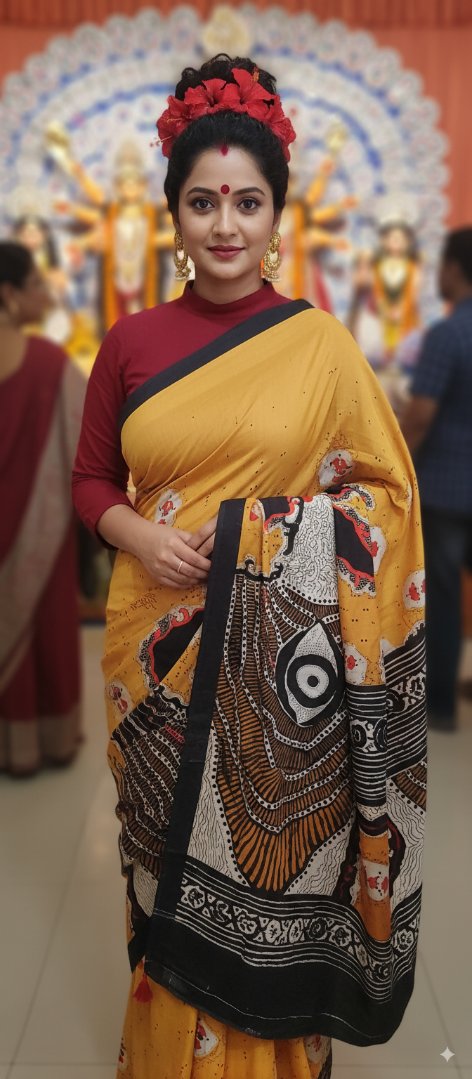 This 'Black Lotus' mul saree literally reflects the energy of a sunshine. This art comes from the series 'DURGA' which is created by visual artist Somya (founder Red Lotus Stories). The gorgeous combination of black and ochre married to the tint of red offers earthy tonal quality to the fabric.