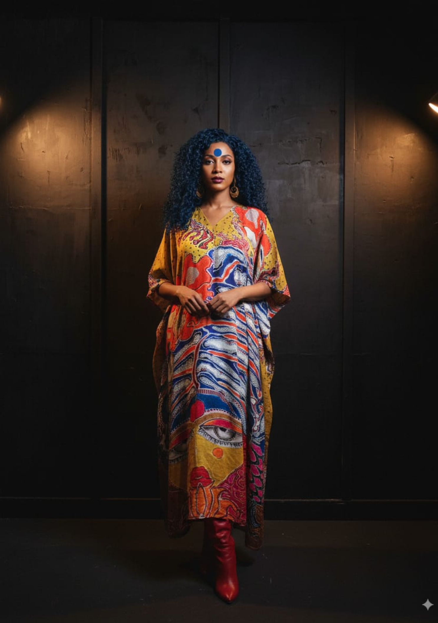 With attention to craftsmanship and detail, this kaftan dress stands beautifully on its own or paired with minimal accessories. Let the Blue-Blessed Durga Kaftan be the statement in your wardrobe—artistry clothing that speaks without saying too much.
