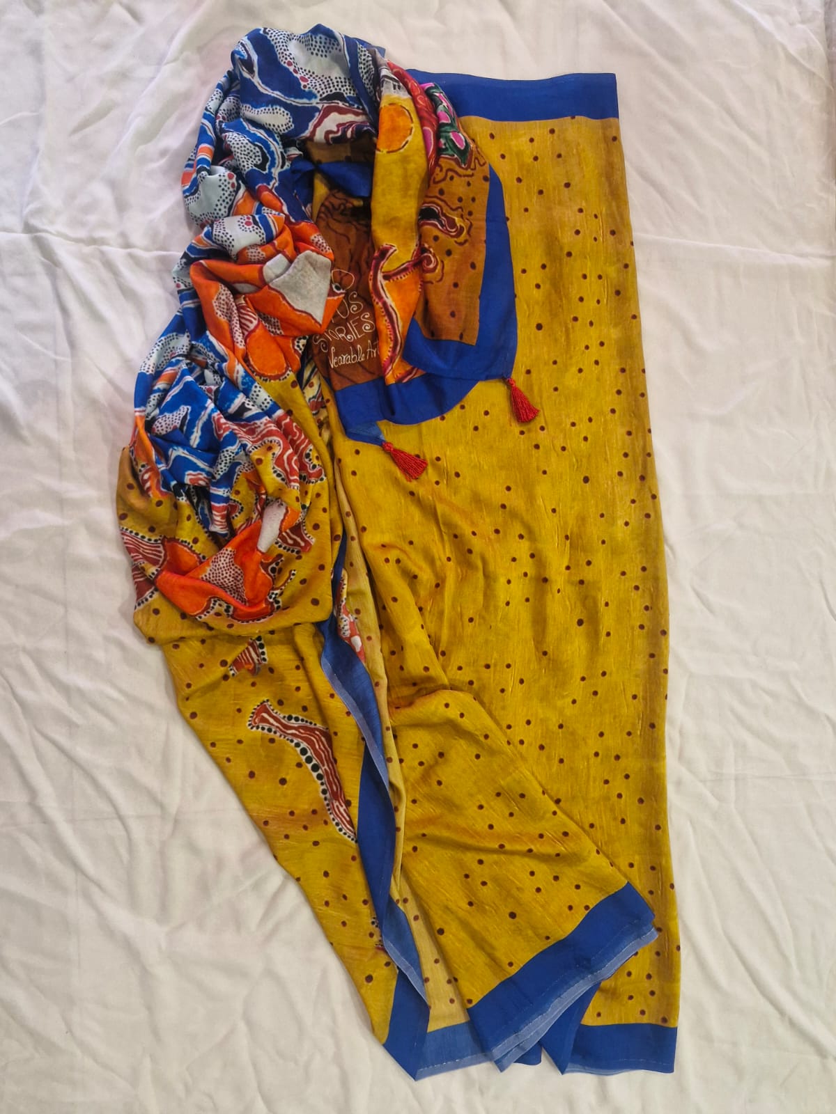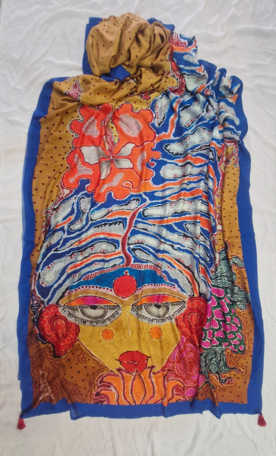 Celebrate personal style with Blue-Blessed Durga Saree exhibiting art print from ‘DURGA’ art series; hand-painted by visual artist Somya, founder of Red Lotus Stories.