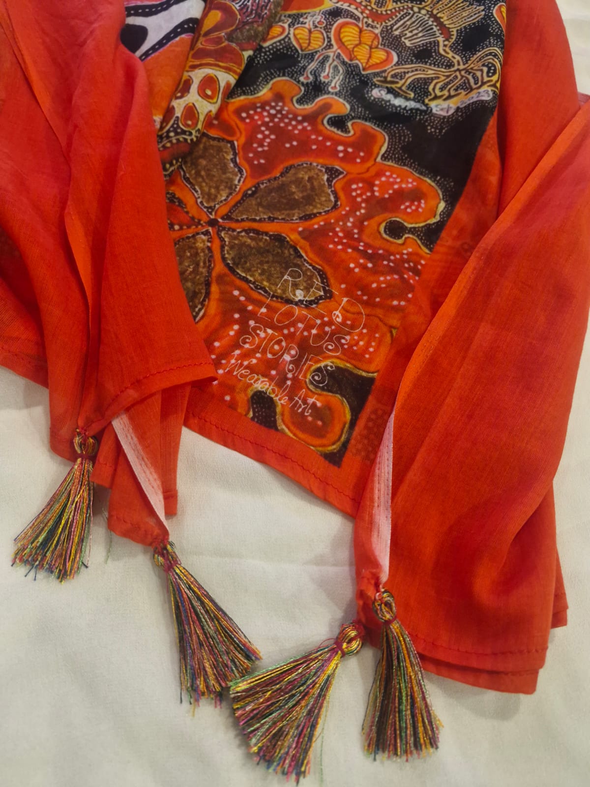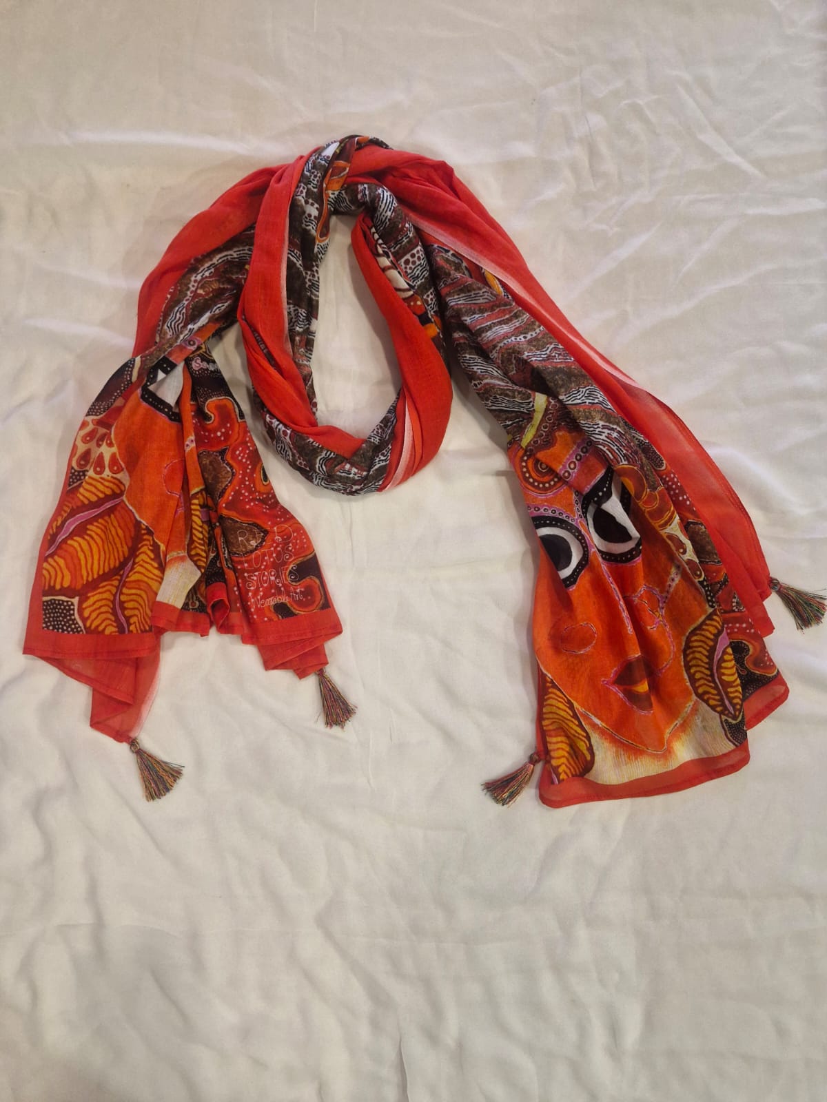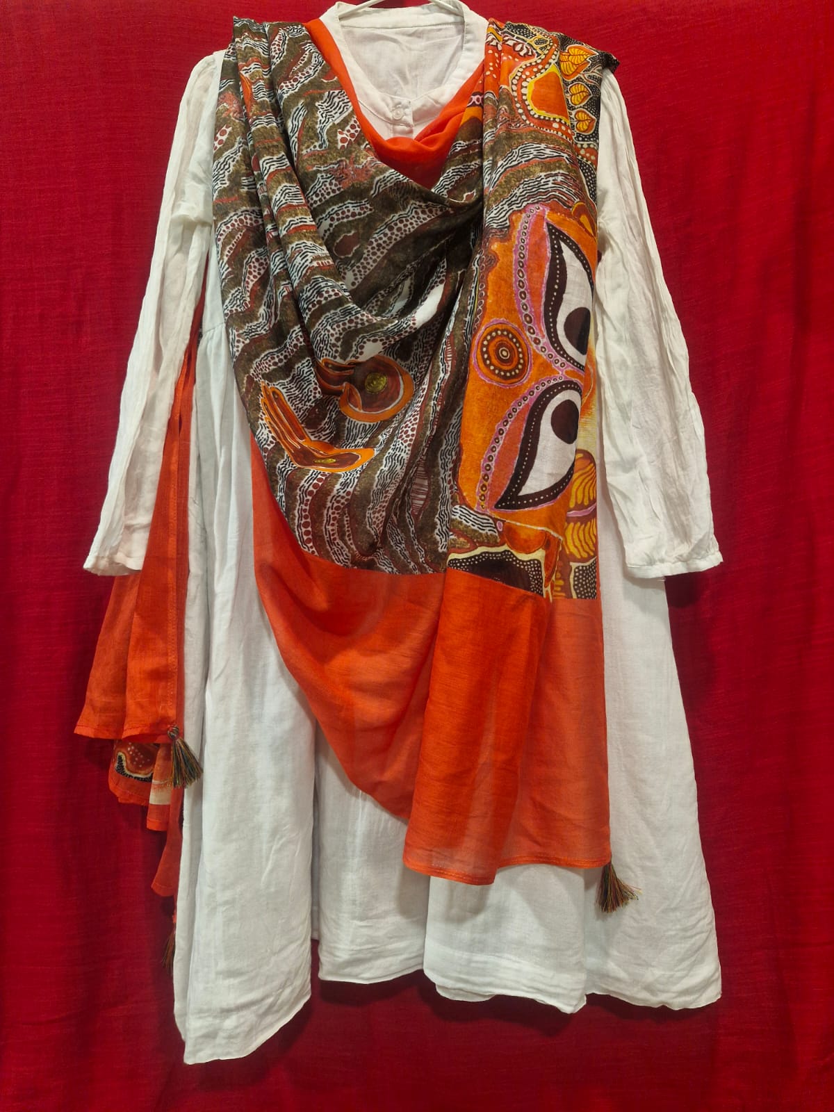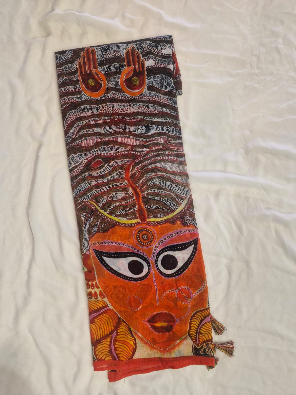 Discover Earthy Durga Stole—where artwork meets wearable expression. The exquisite mul fabric exhibits the print of goddess Durga artwork from the art series hand-painted by Somya, founder Red Lotus Stories.