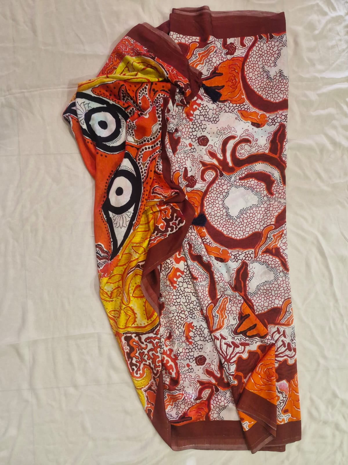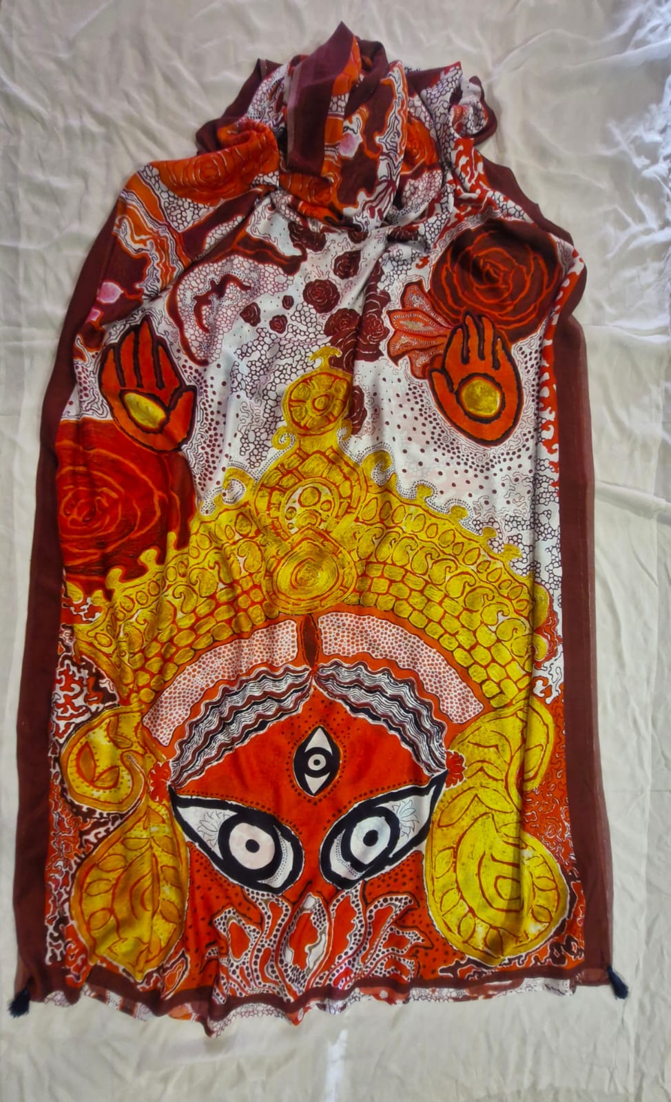 Celebrate personal style with Golden Goddess Durga Saree exhibiting artwork from ‘DURGA’ art series in an ecstatic print form.