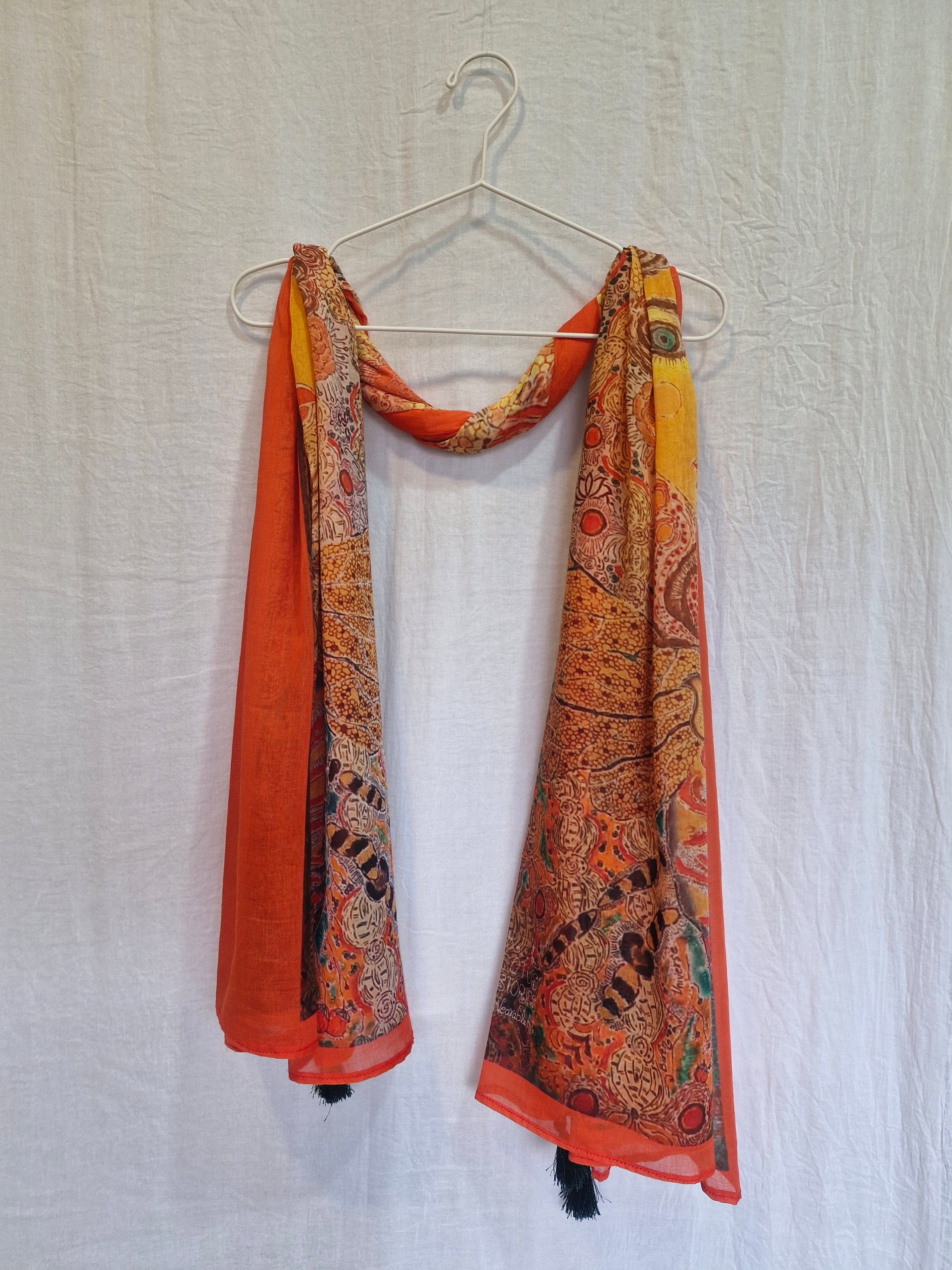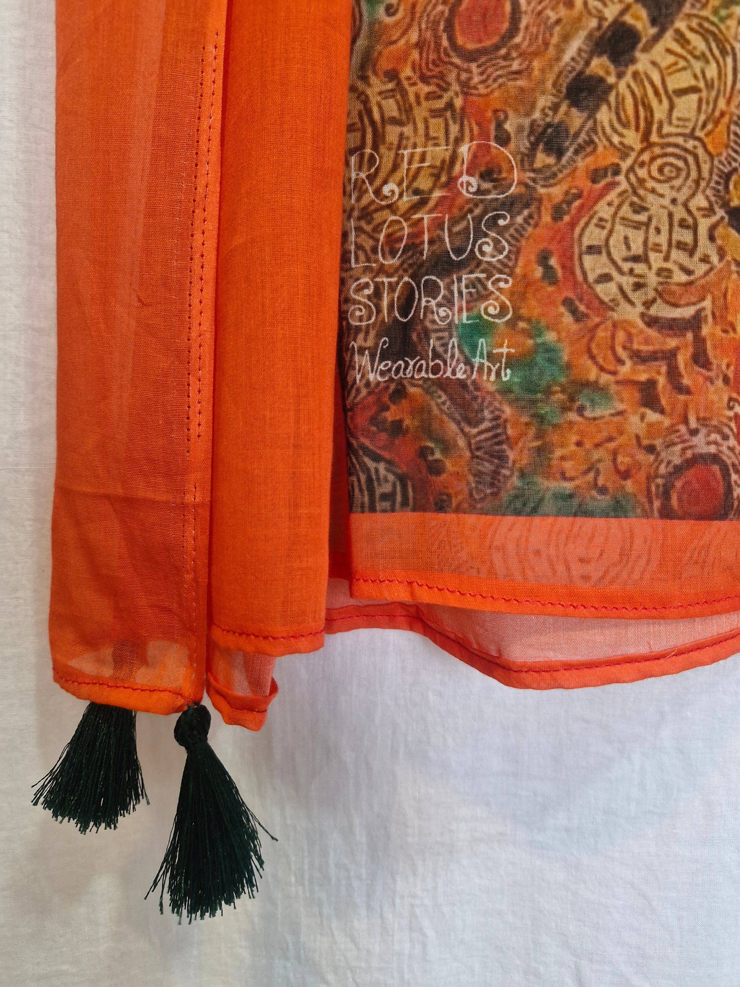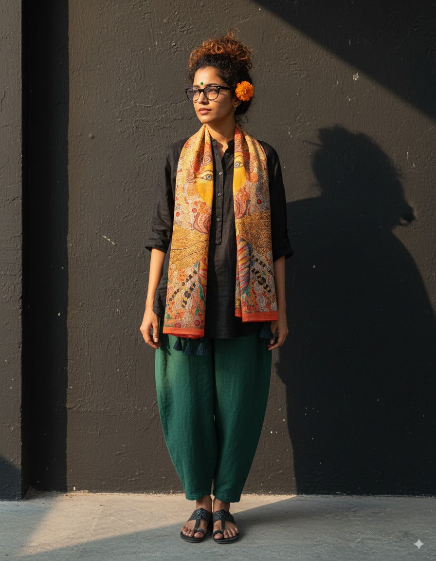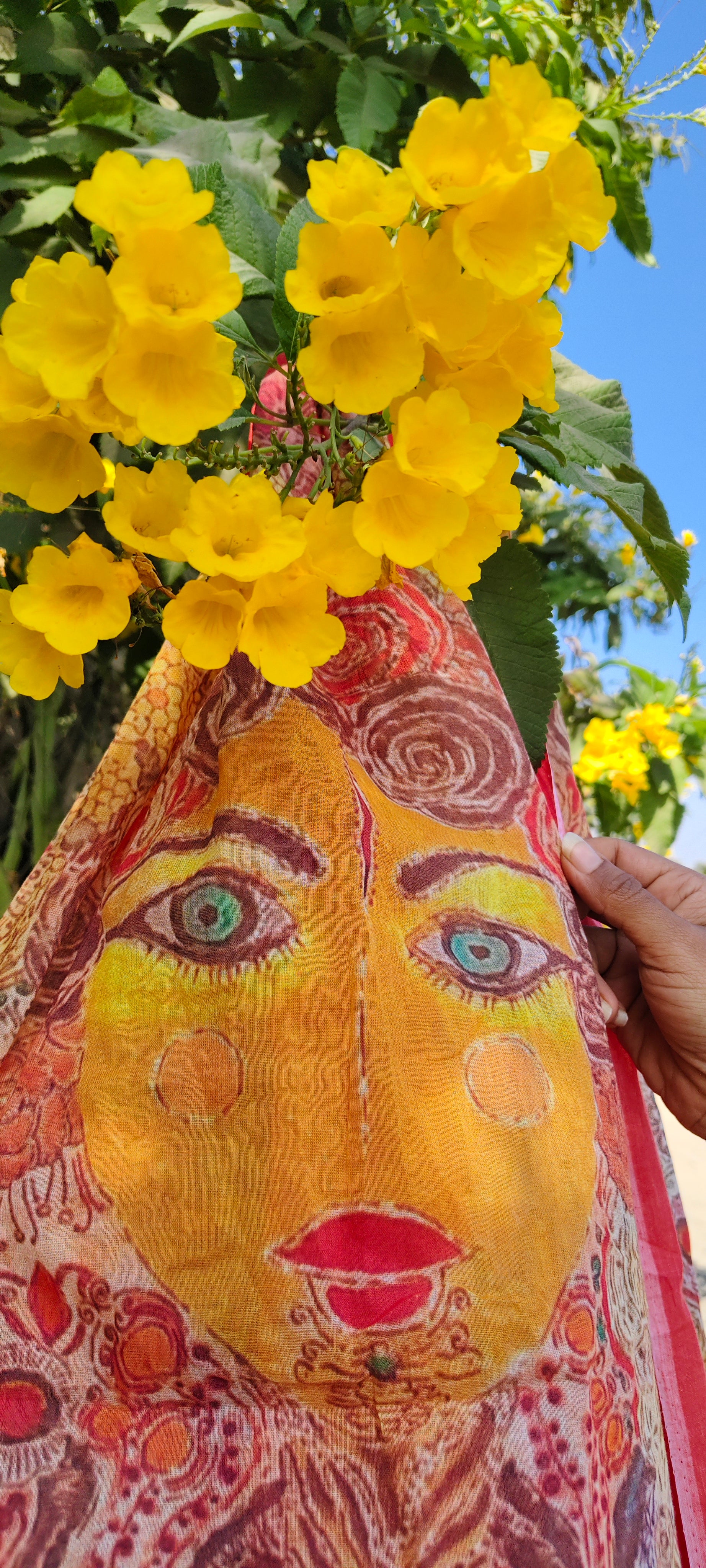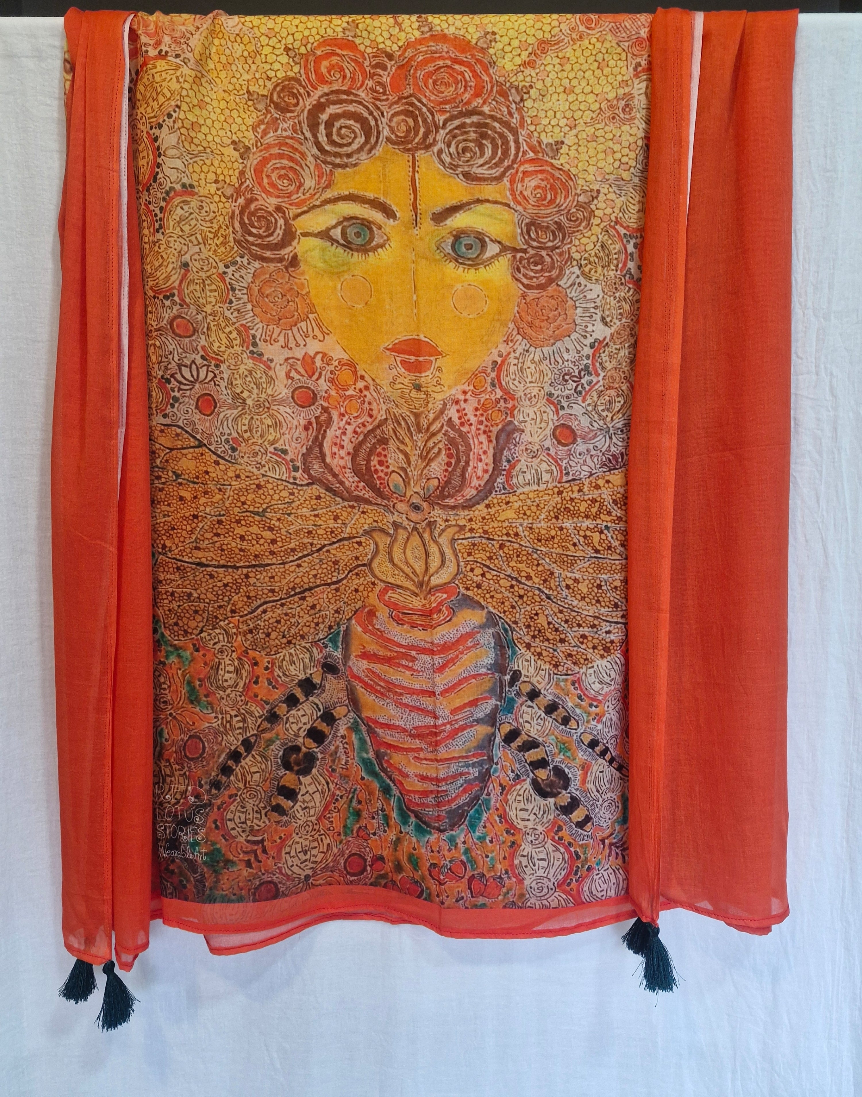 Honeybee Stole captures hand-painted fashion with expressive style—merging saree with t-shirt elegance and the artistic soul of Red Lotus Stories.