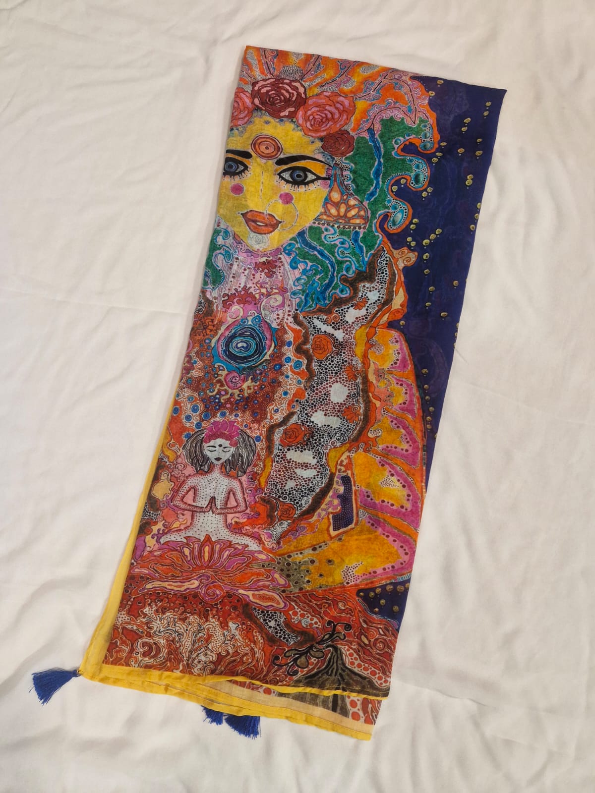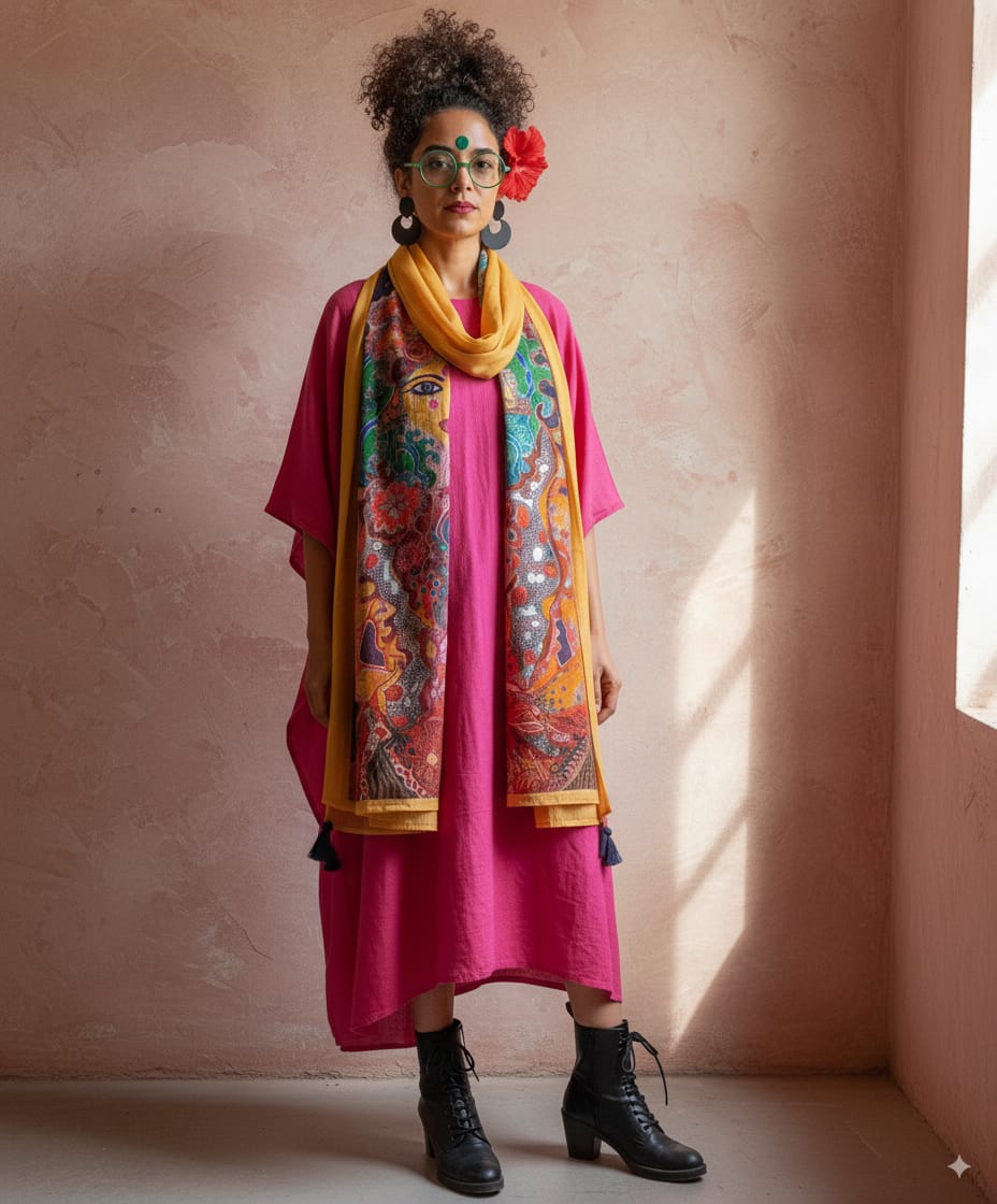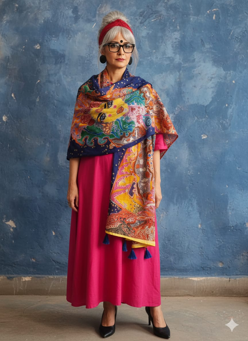Shop the Raasleela stole from Red Lotus Stories — an exquisite piece of wearable art. This hand-painted masterpiece adds an artistic flair to your wardrobe, perfect for pairing with kaftan dresses, graphic tops, and aesthetic t-shirts. Elevate your style with this silk kaftan dress or summer Indian cotton dress for a unique, artistic clothing experience. Explore the fusion of traditional and contemporary fashion, ideal for your Durga Puja dress or a chic night out.