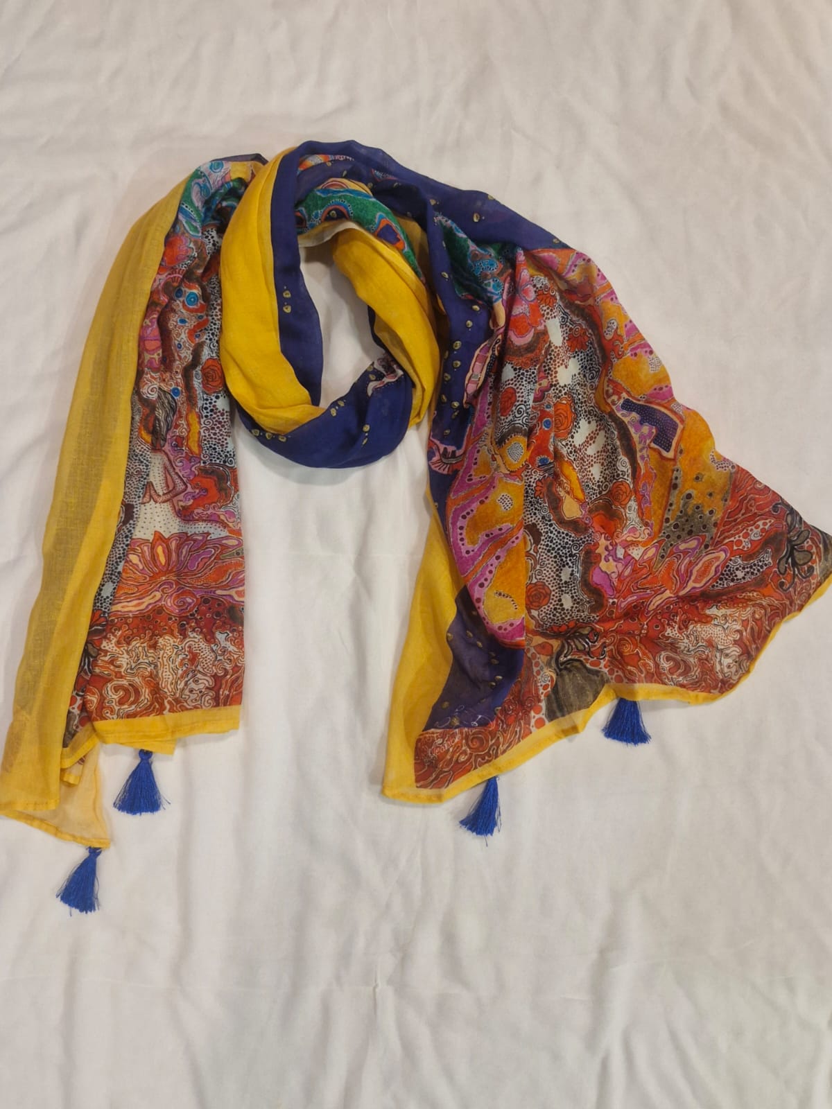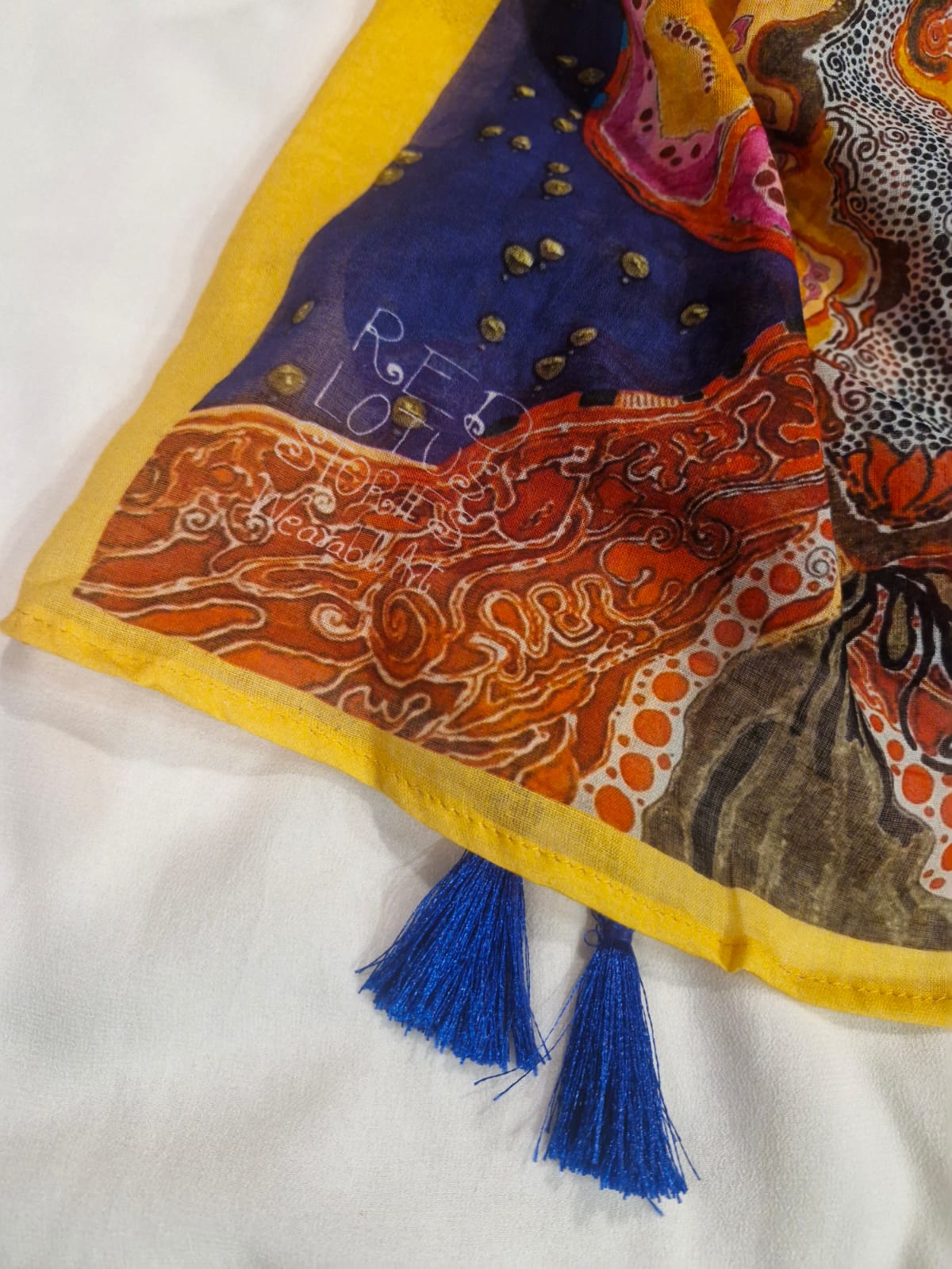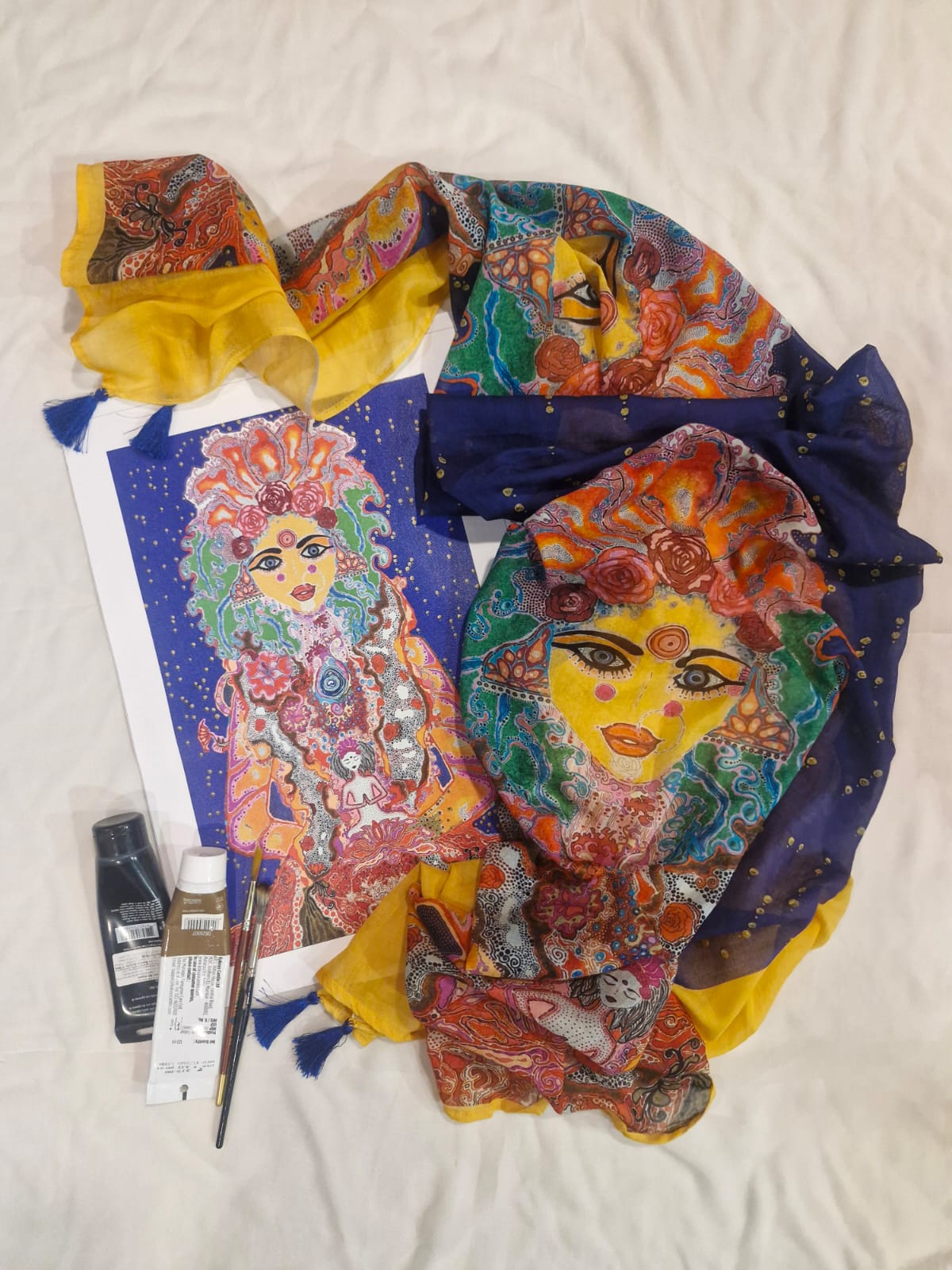 Shop the Raasleela stole from Red Lotus Stories — an exquisite piece of wearable art. This hand-painted masterpiece adds an artistic flair to your wardrobe, perfect for pairing with kaftan dresses, graphic tops, and aesthetic t-shirts. Elevate your style with this silk kaftan dress or summer Indian cotton dress for a unique, artistic clothing experience. Explore the fusion of traditional and contemporary fashion, ideal for your Durga Puja dress or a chic night out.