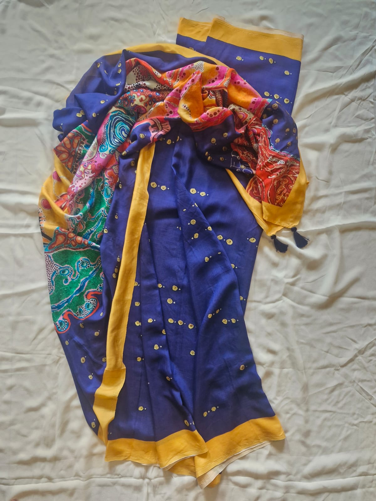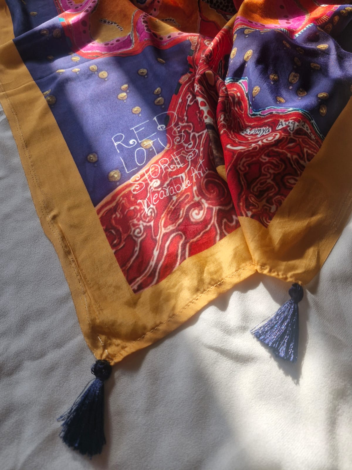 Love, it is! This mul saree exhibits the artwork 'Raasleela' from the series 'Queerism in Indian Mythology' created by Somya (founder of Red Lotus Stories).