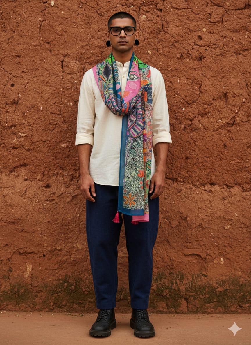 Shivparvati Stole—featuring artwork from ‘Queerism in Indian Mythology’, this mulmul piece drapes like second skin, adding layered charm in every season.