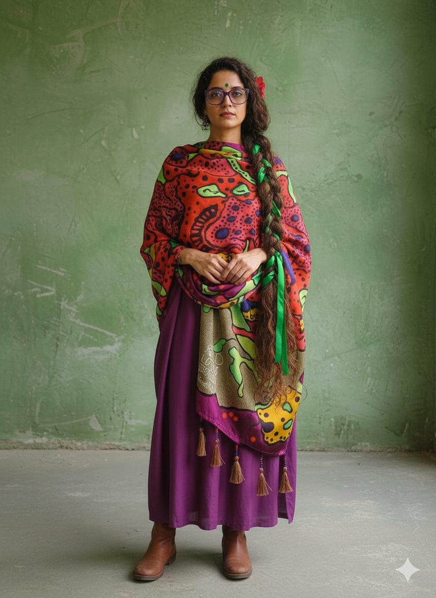 The Shroom Chakra Dupatta is a vibrant explosion of colour and creativity—a wearable art piece that transforms any outfit. It drapes beautifully, adding movement and flair. Whether paired with ethnic dresses or kaftans, this dupatta becomes the focal point of your look.