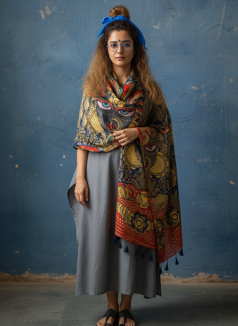 Zone Chakra Dupatta is a striking wearable art piece crafted in modal silk, sized at 2.5 m × 1.15 m, designed to drape with fluid elegance. Its design combines bold hues and fine craftsmanship to bring a sense of dynamic calm — perfect to pair with ethnic dresses or kaftans for women.